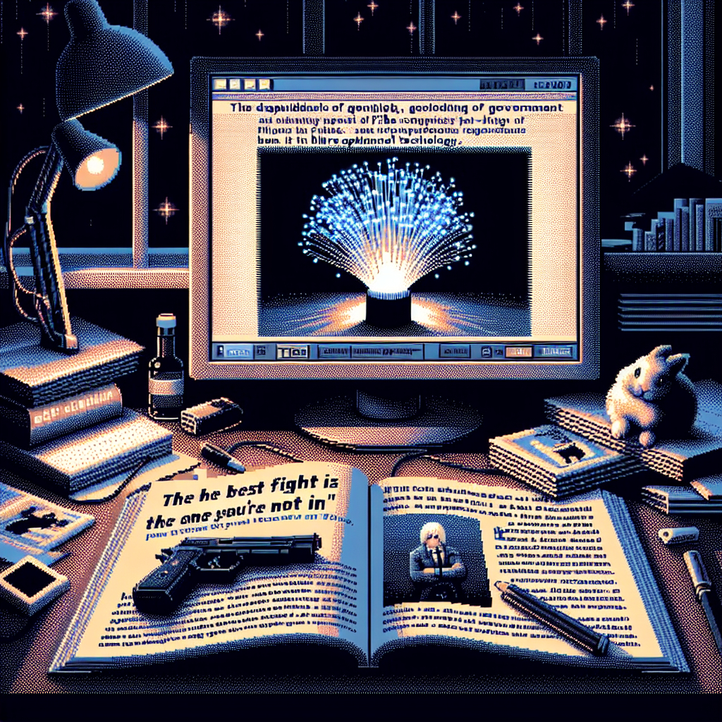 First up, we’re thrust into a nostalgic setup reminiscent of the late 80s computing era, but with a modern twist. The scene is littered with the tools of the digital artisan: floppy disks, a pixelated lamp shedding light on a keyboard below, and a book that proclaims, “The best fight is the one you’re not in,” a playful nod to both strategic pacifism and perhaps the avoidance of digital overload.